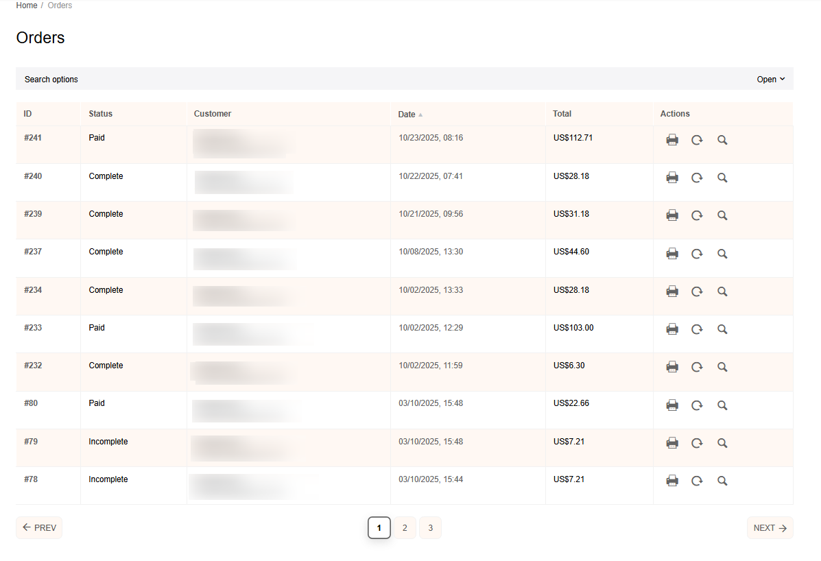 To check on your Orders, you will need to access by the user icon and check on My Orders. You will see the list of your orders. You can access to the information on each of those Orders by clicking on the ID number of the order.