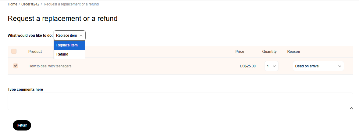 You will see this page. You need to choose the product that is having the issue. And at the top select the option to Refund or Replace item.