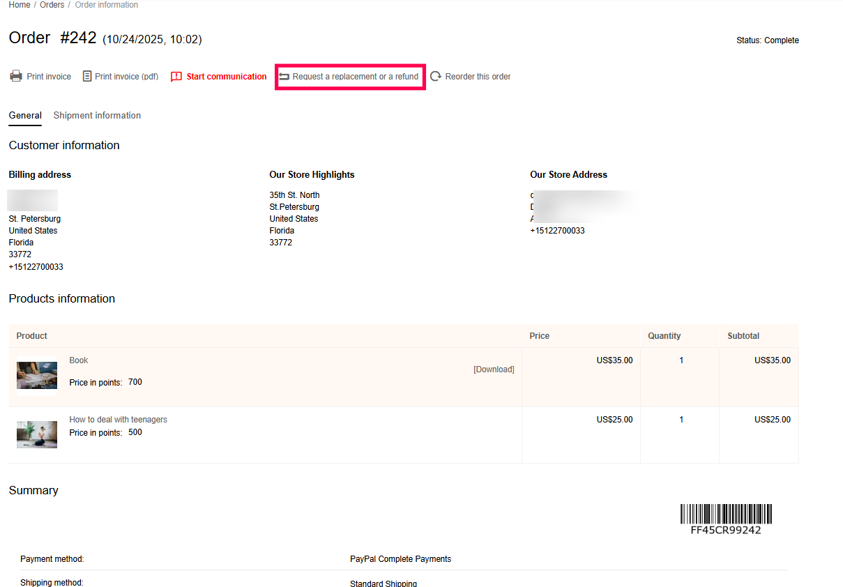 Enter to the order with the issue. Below the order number you will see some options. To request a replace or refund you need to click on the option under "Request a replacement or a refund".